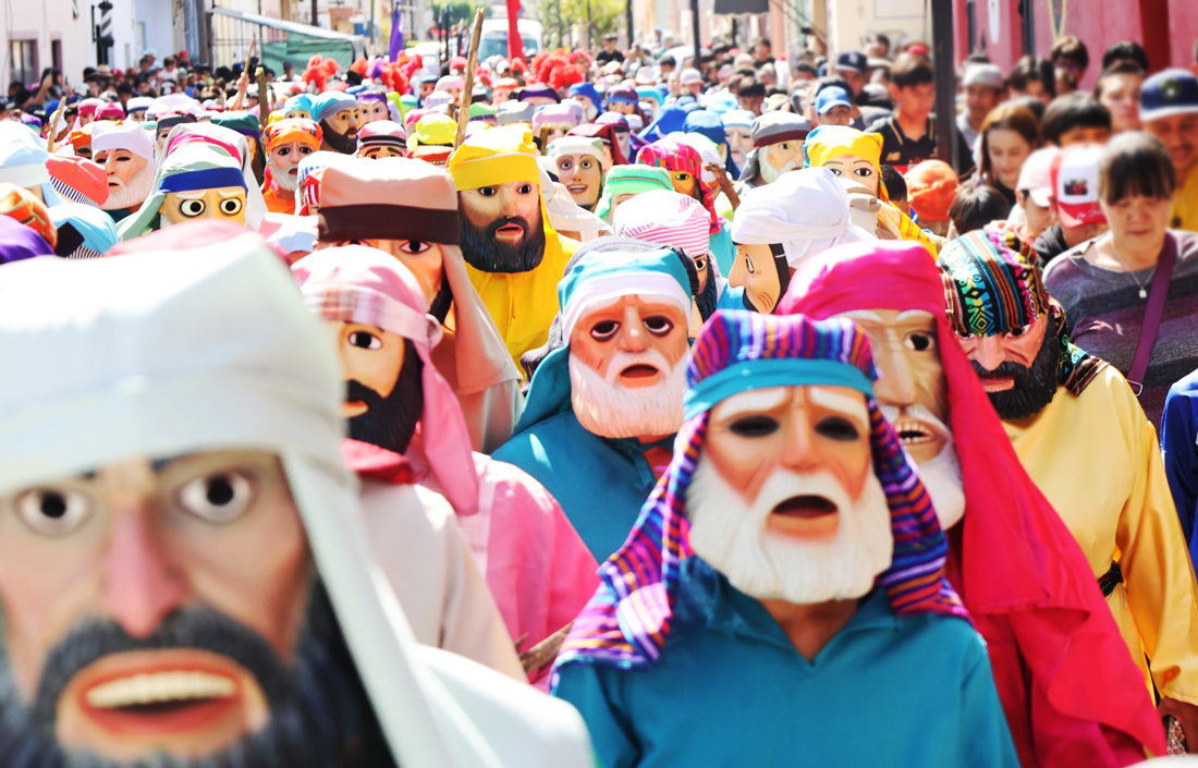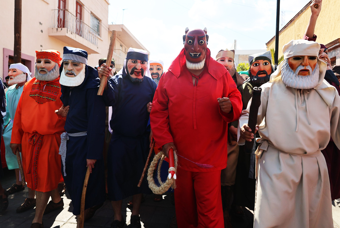 La agrupación de La Judea, ataviados con máscaras, vestidos de colores, huaraches y el tradicional grito «¡uuuuuuuhhhh! empuñando fuerte el mando, salieron ordenados al ritmo que marcaron los soldados.