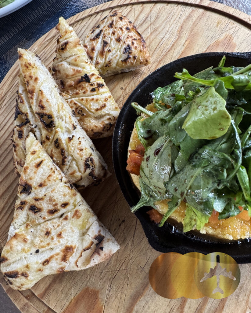 Como entrada pedimos un provolone asado, fue presentado en un sartén de hierro fundido que hace que la temperatura continúe (podrán percatarse de la acción en el video del TikTok: misslivingandtravel ) y estuvo coronado con un poco de tomate y una ensalada de arúgula con vinagreta de balsamico de la casa que le iba perfecto.