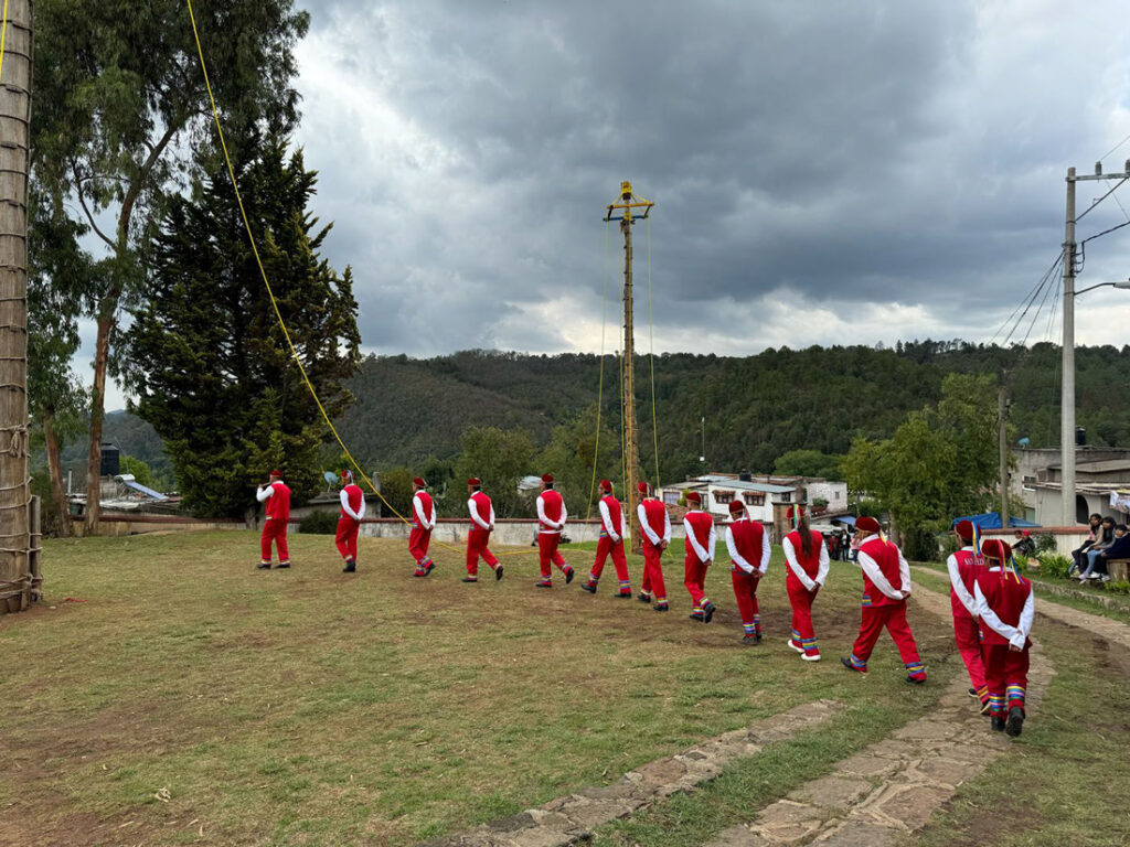 Durante el vuelo, los cuatro danzantes dejan caer el cuerpo, sujetado por una soga a la cintura, haciendo que la gravedad los atraiga hacia sus raíces, con las manos extendidas para recoger las bendiciones.