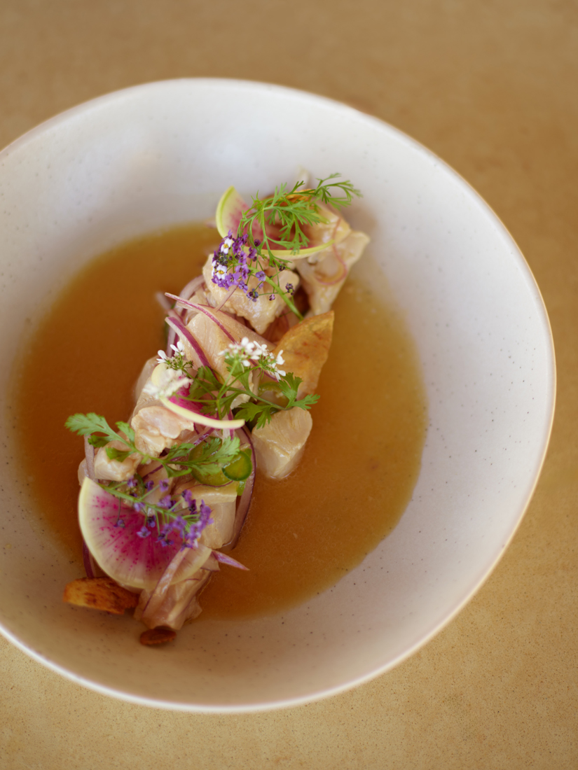 La cocina celebra la frescura y la sencillez elegante: crudos, pescados al grill, pastas hechas en casa mientras e uso de ingredientes regionales como cítricos, tomates de la zona, hierbas frescas y mieles locales aporta profundidad y carácter, dando vida a una propuesta luminosa.
